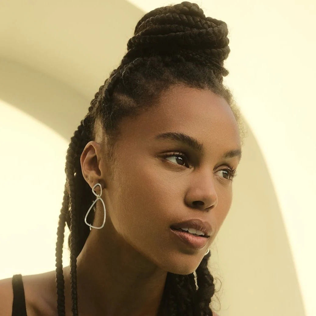 Les Voluptueuses: three divinities. Calista (Spirit of perfection), Hemera (Goddess of the Earthly Light) & Apheleia (Spirit of simplicity), sublimate the skin. The curves gently reveal the brilliance of the Silver Héméra Nue Earrings and allow the jewel to dance delicately near the skin.