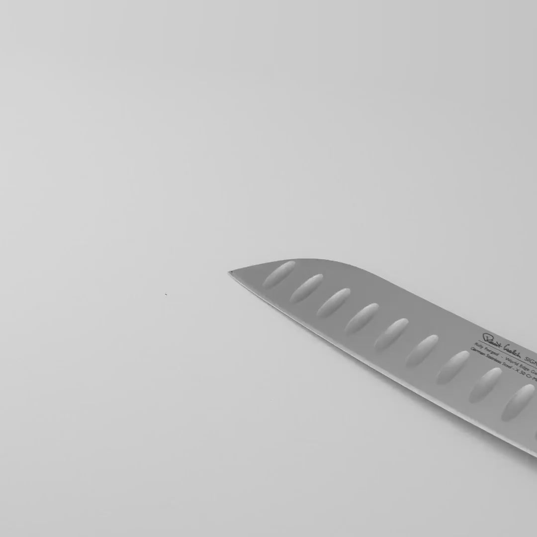The 17cm santoku knife has a wide scalloped blade for precision slicing and dicing. Fully forged from high quality German stainless steel with a hand applied 15° edge for superior sharpness, and an ergonomic handle. All Signature kitchen knives are gift boxed.